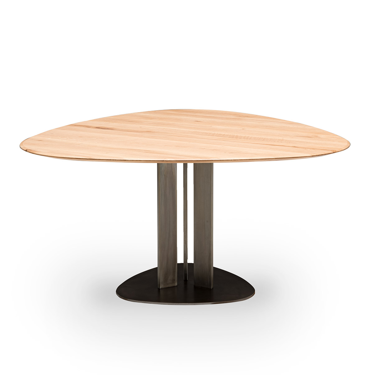 Tapas de roble macizo de 30 mm de espesor, superficie cepillada. Base de acero pintado en polvo u oxidado con acabado acrílico.