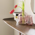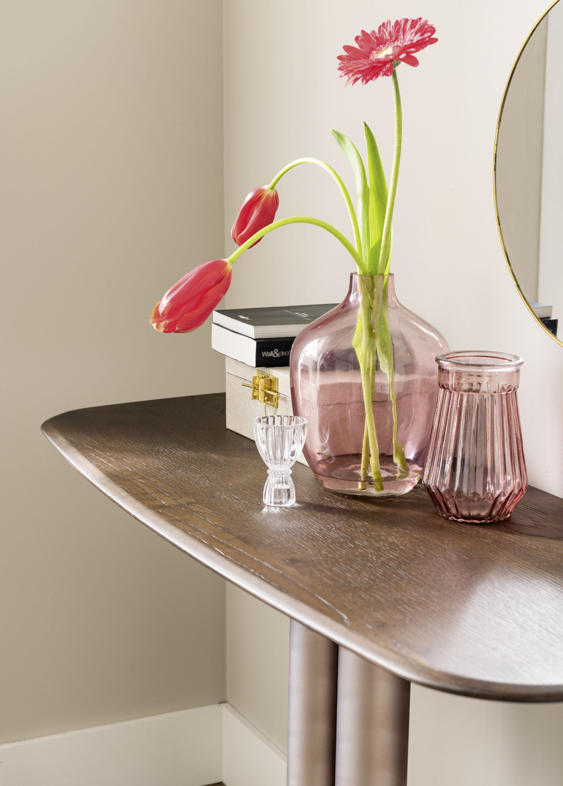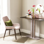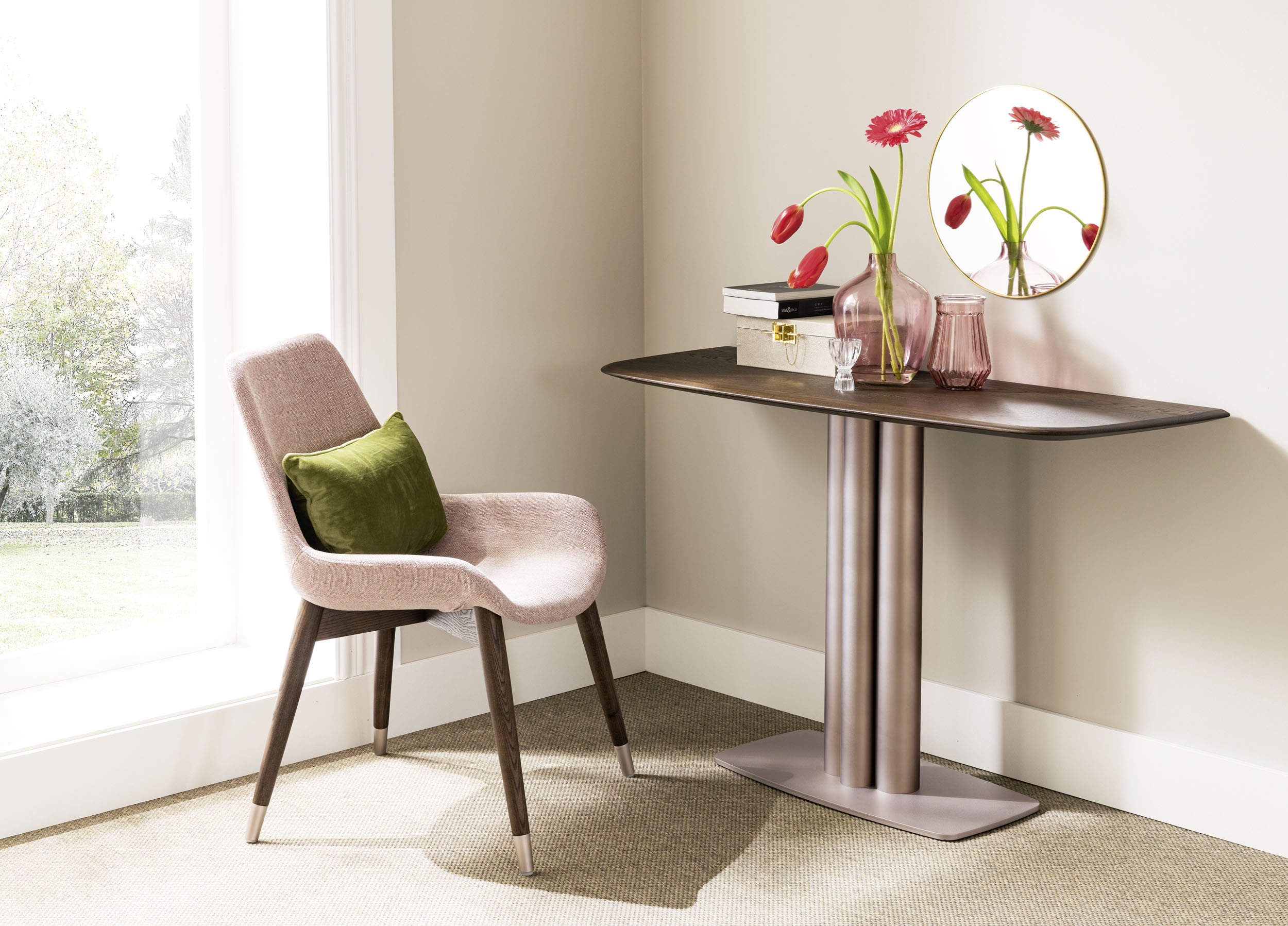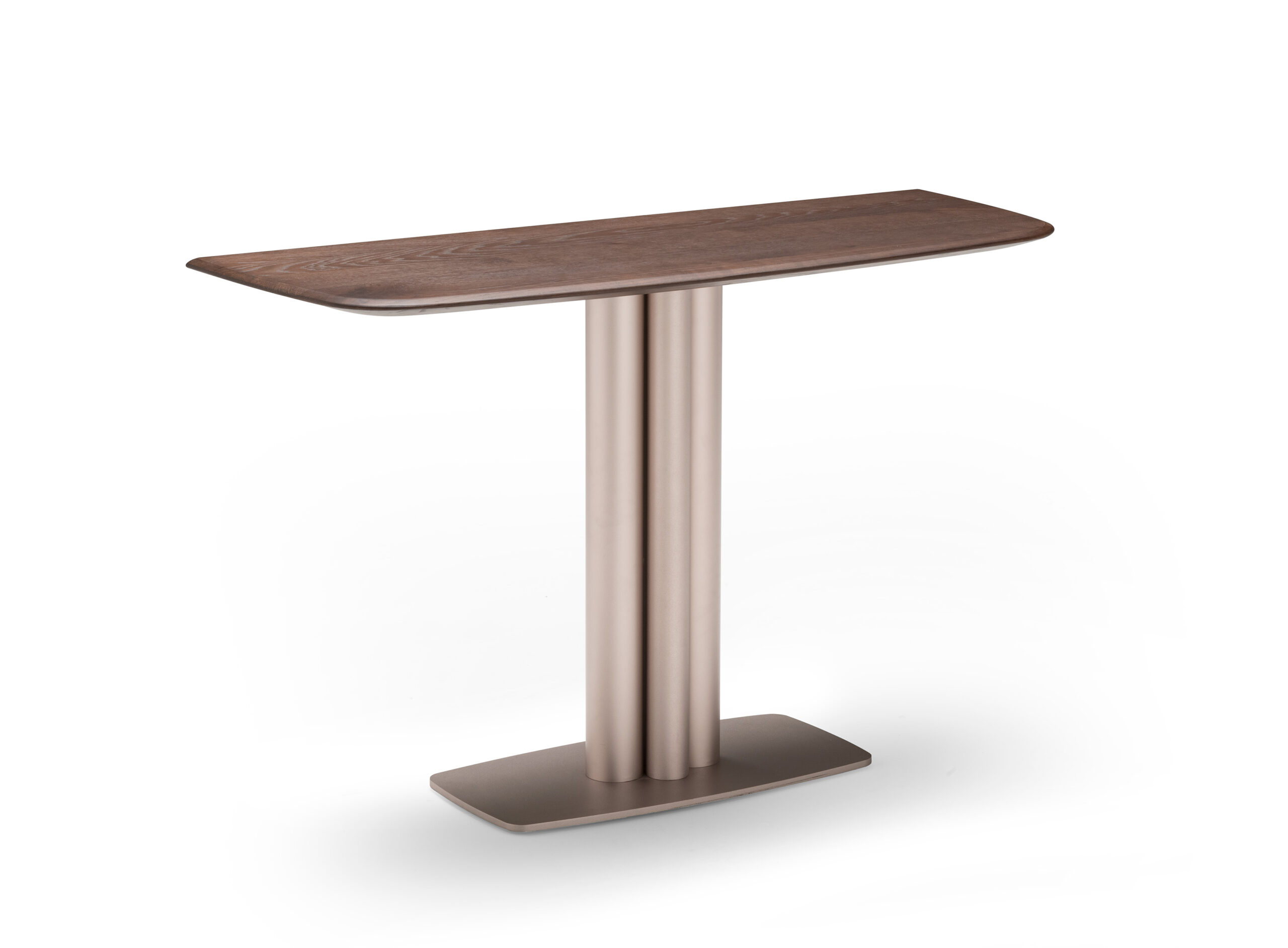 Tapas de roble macizo de 30 mm de espesor con superficie cepillada o de nogal canaletto macizo sin cepillar. Colas vinílicas al agua, pinturas acrílicas de dos componentes. Base en acero con recubrimiento de polvo acrílico.