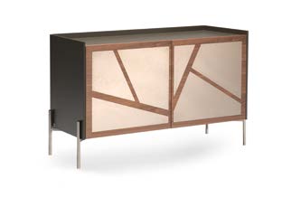 Carcasa disponible en dos versiones: texturada o en madera de roble. Las puertas son de roble. Bases de acero pintado en polvo u oxidado con acabado acrílico. Alternativamente, plexiglás transparente extraclaro de 15 mm de espesor.