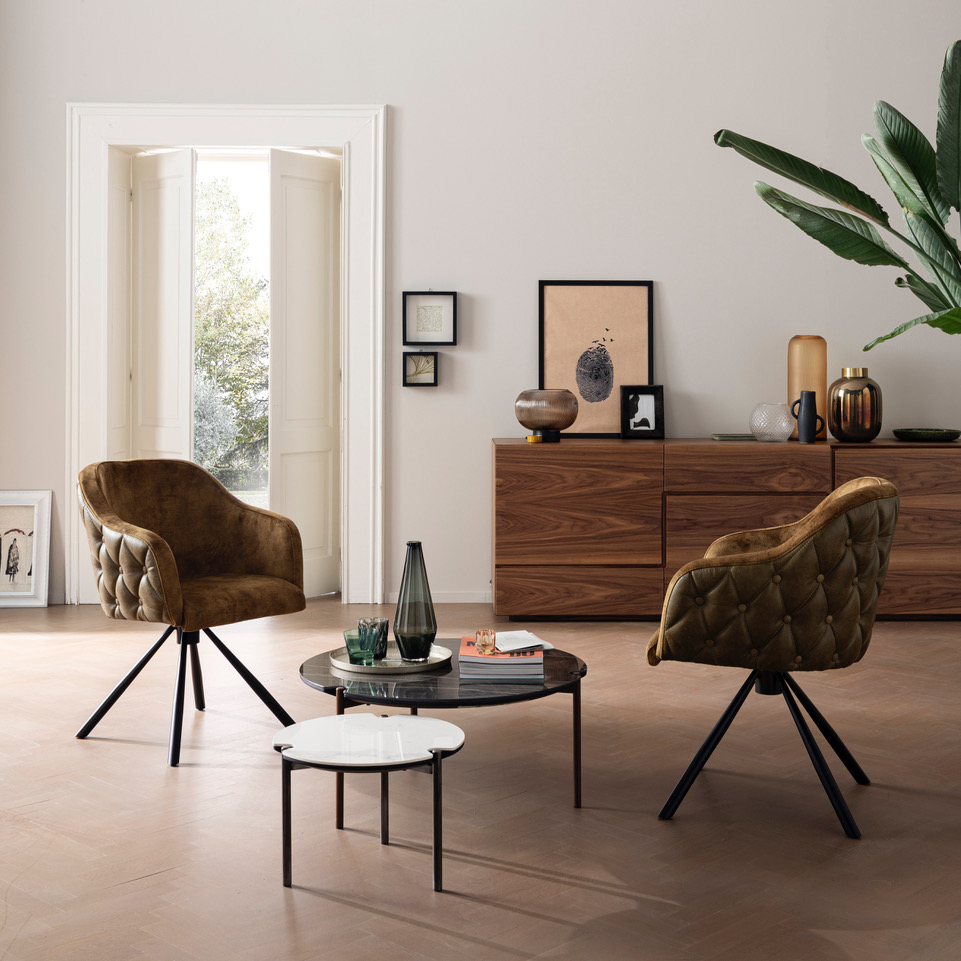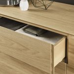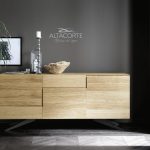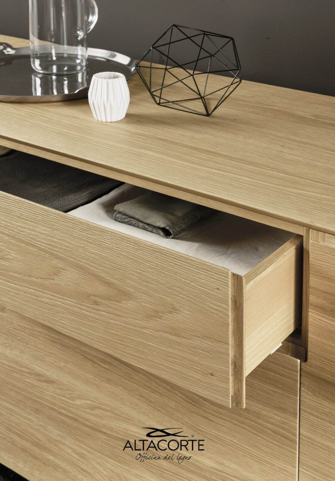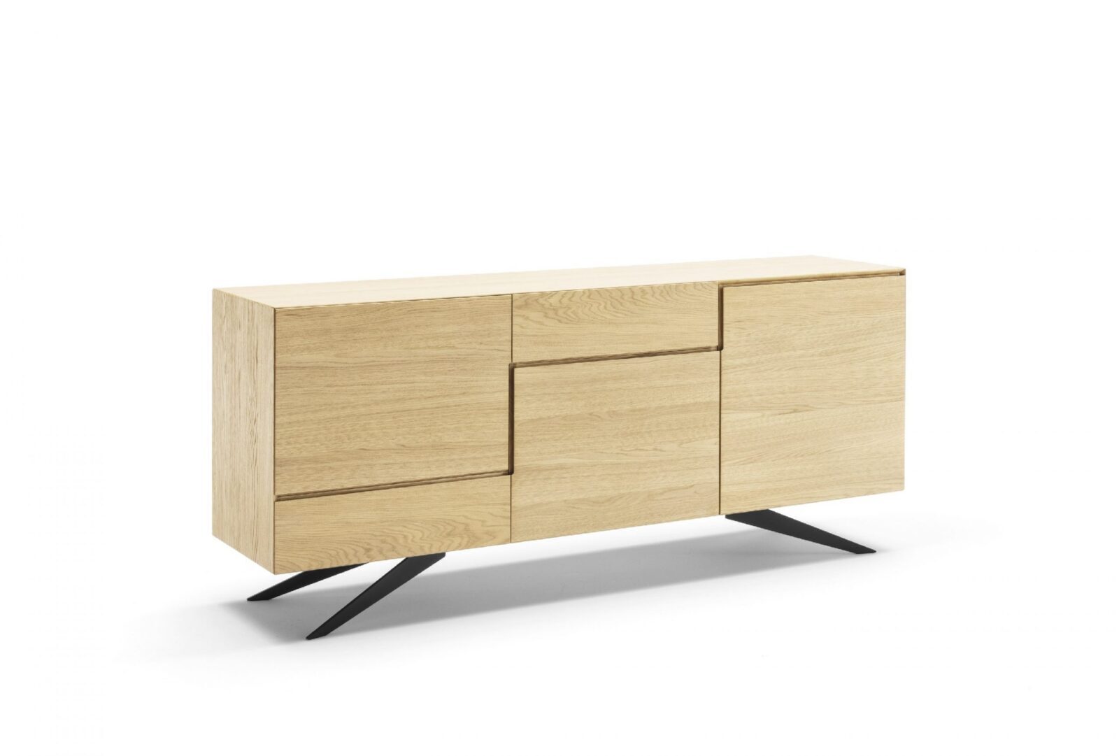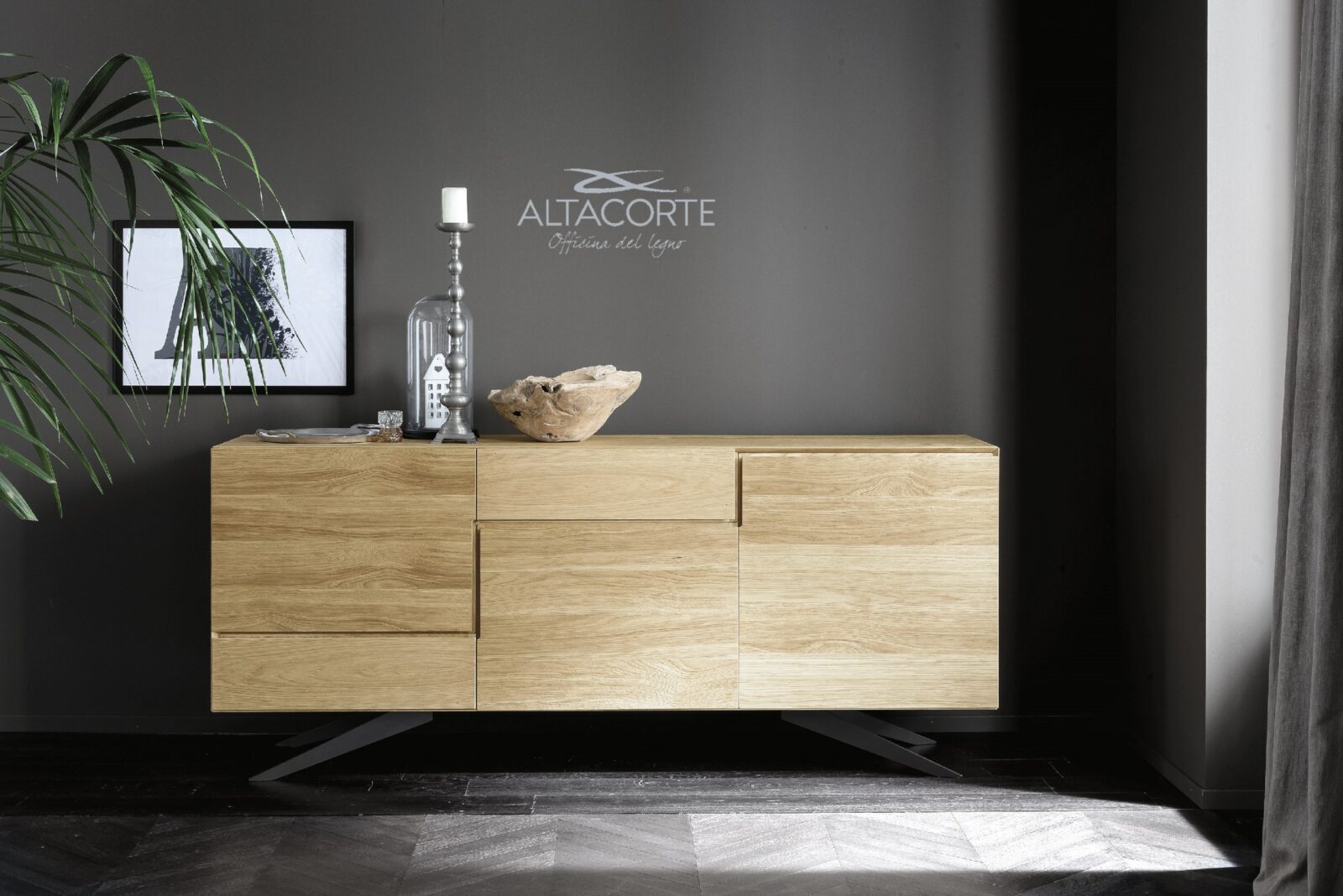 Aparador con 3 puerta y 2 cajones, realizada totalmente en roble con superficie externa cepillada. Parte posterior con revestimiento de acabados. Colas de vinílico y resinas ureicas base agua conformes a las normativas UNI-CEE. Base de acero recubierto con pintura de polvo u oxidado con acabado acrílico.