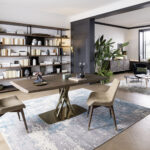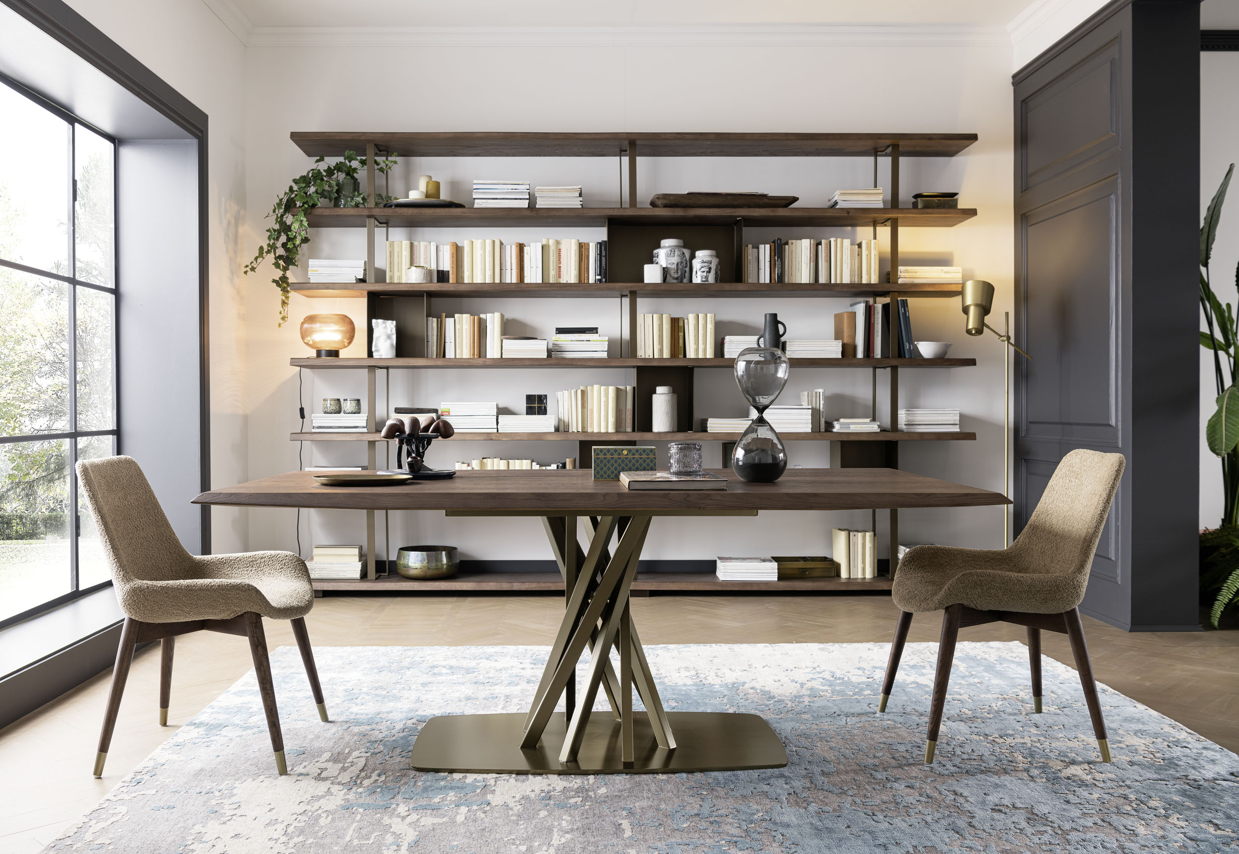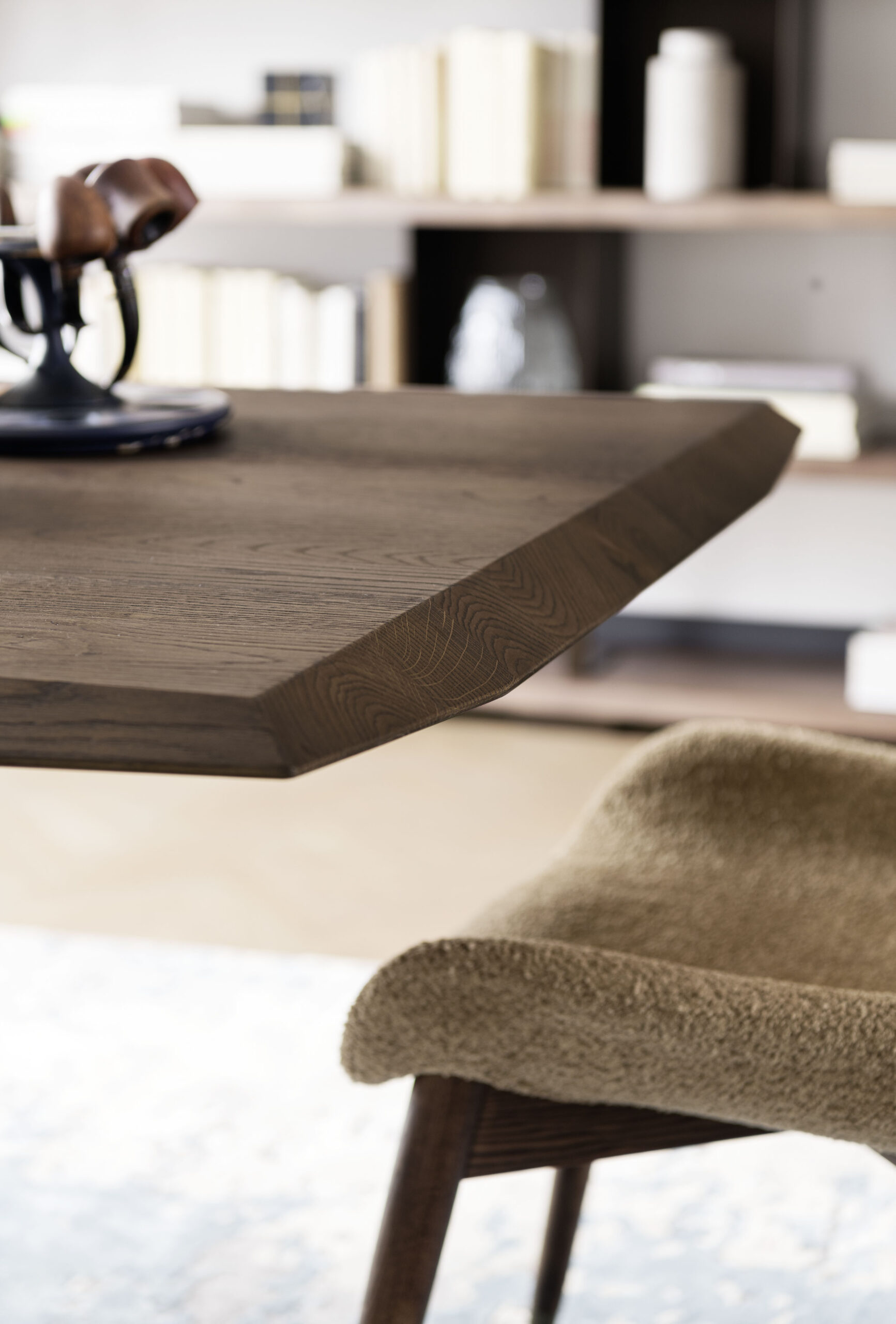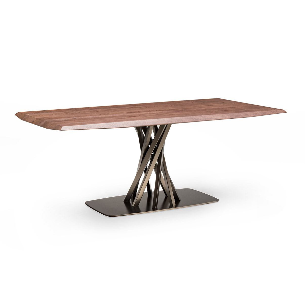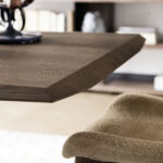 Tapas de roble macizo de 40 mm de espesor, superficie cepillada, de nogal canaletto o de cerámica. Base de acero pintado en polvo con acabado acrílico.