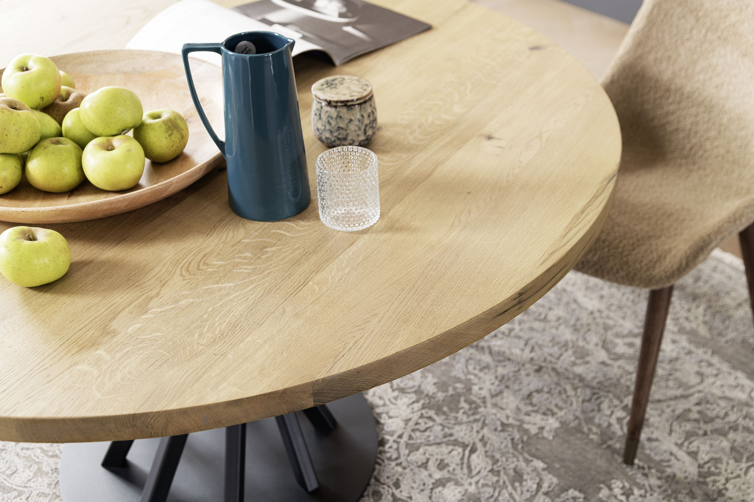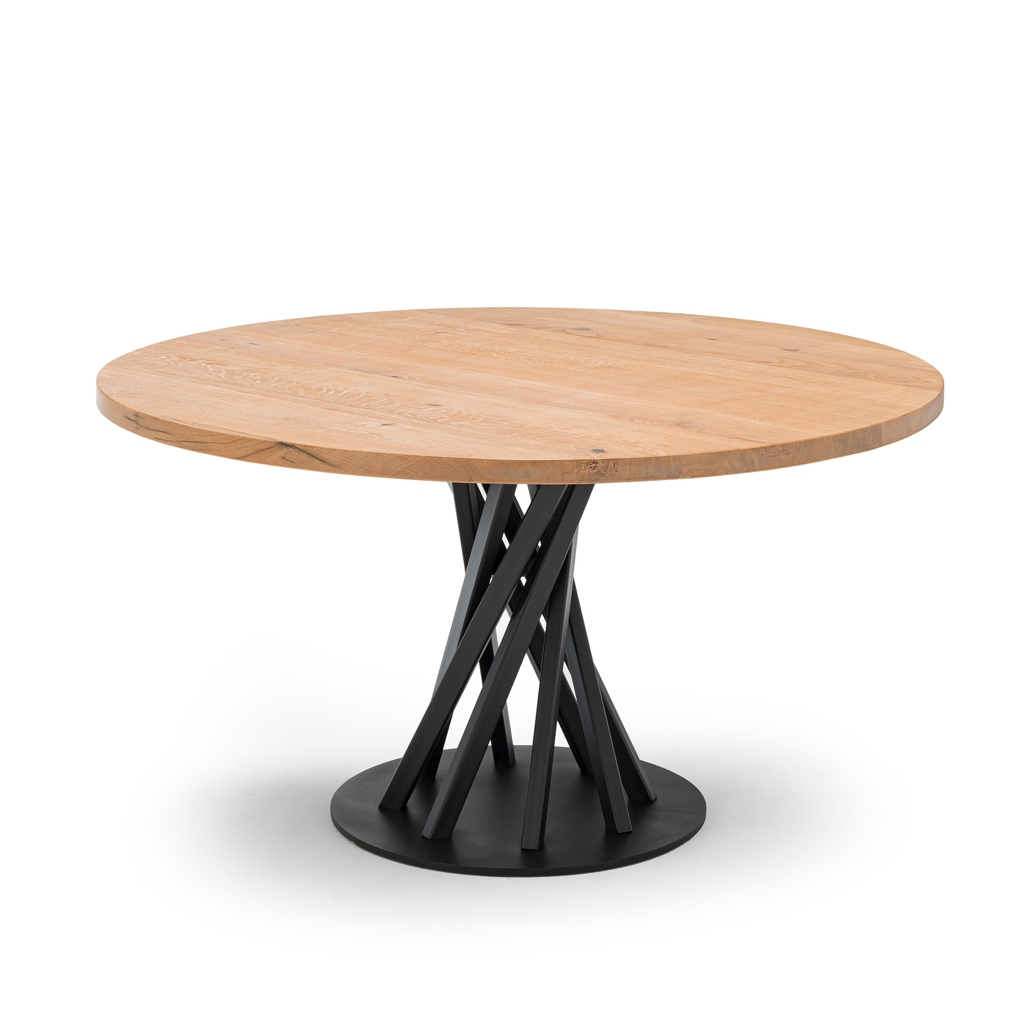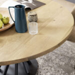 Tapas de roble macizo de 40 mm de espesor, superficie cepillada, de nogal canaletto. Base de acero pintado en polvo con acabado acrílico.