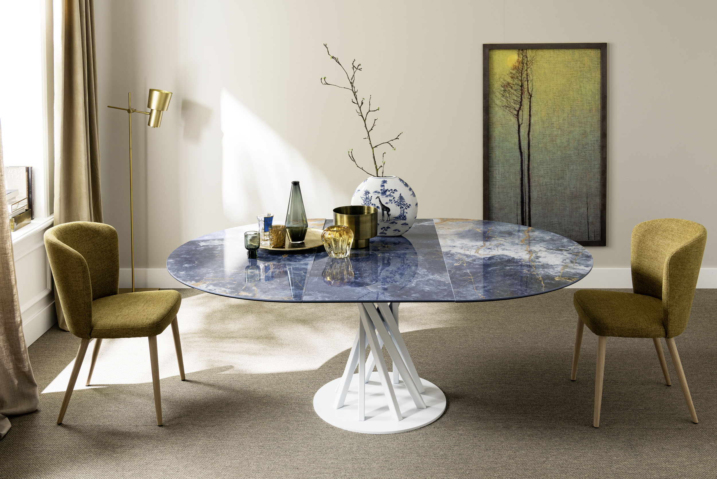 Tapas de roble de 20 mm de espesor con superficie cepillada, de nogal canaletto o de cerámica combinada con cristal. Base de acero pintado en polvo con acabado acrílico.