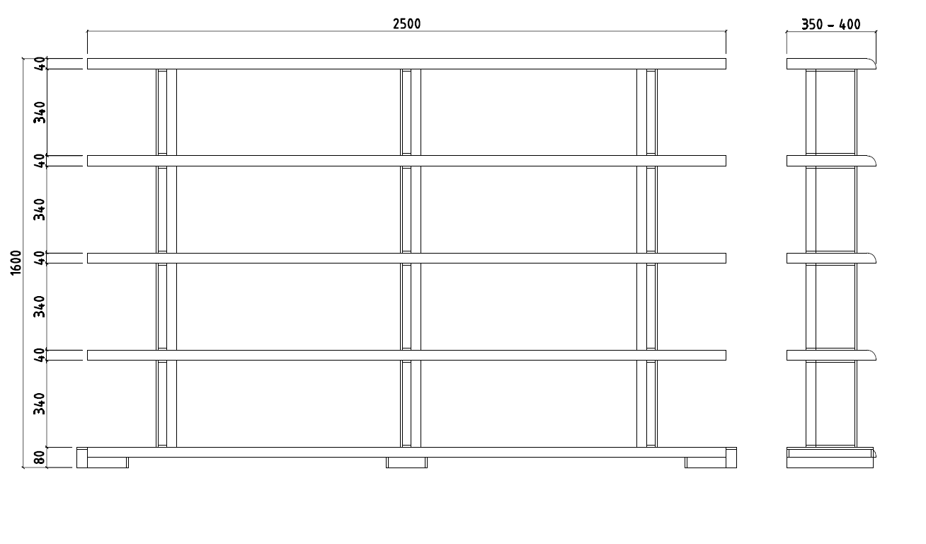 Soportes estructurales de hierro, estantes de roble macizo espesor 40 mm.