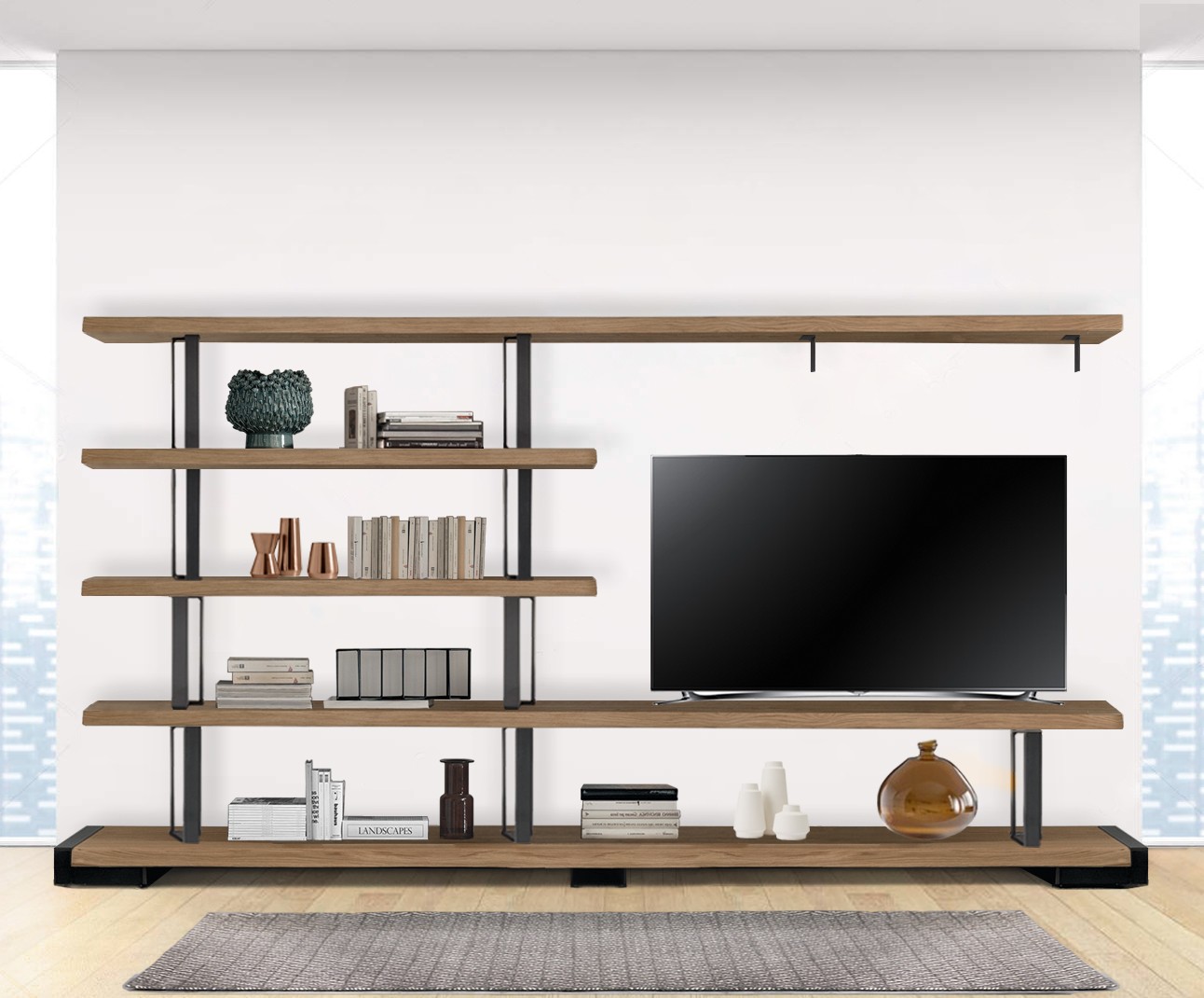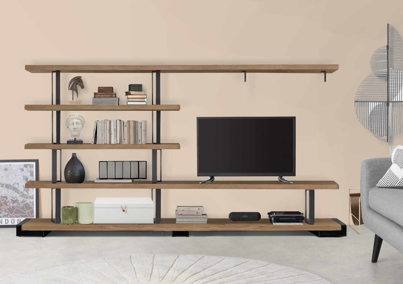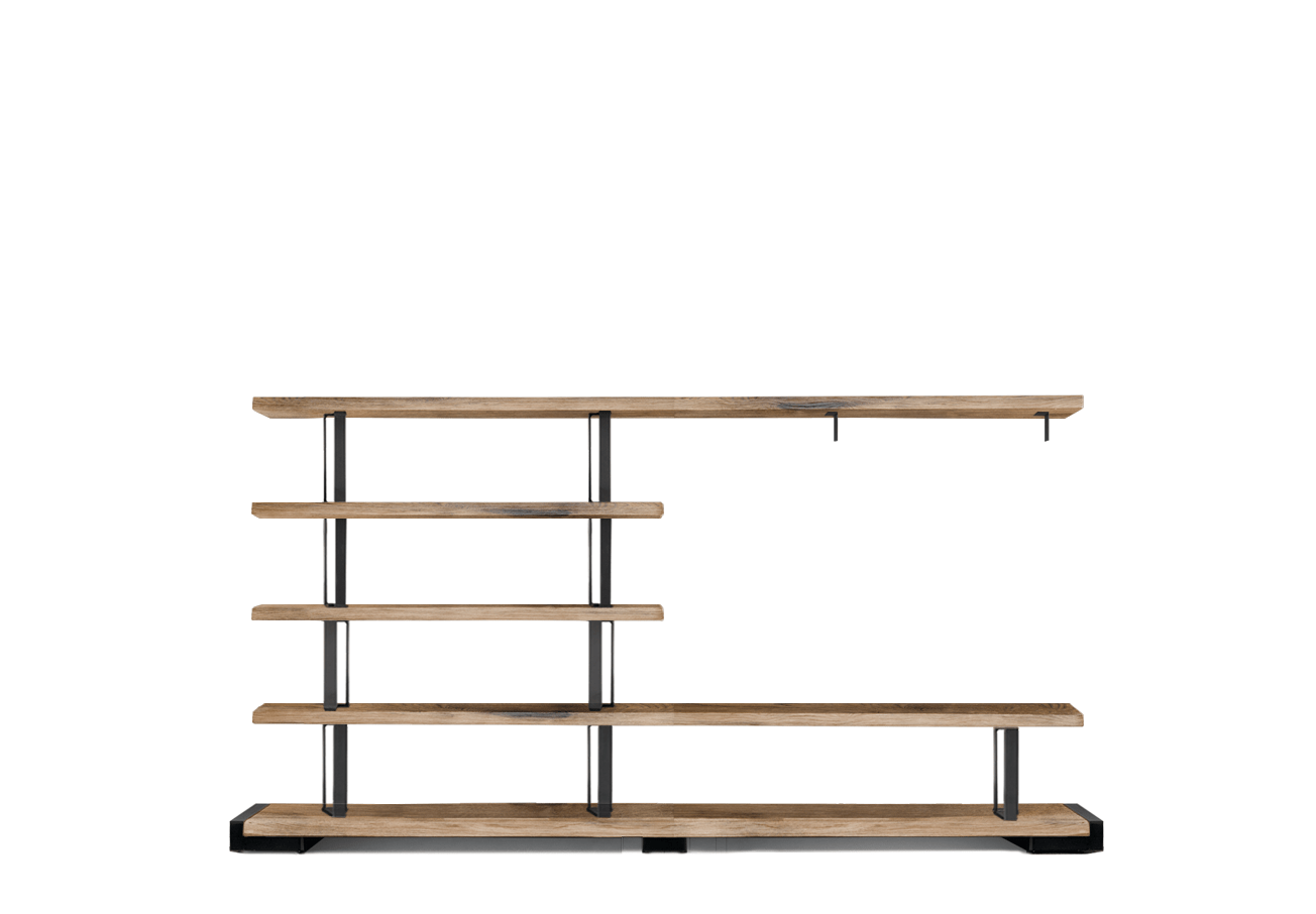 Estantería con esquema fijo de roble macizo con borde irregular y con soportes estructurales de hierro de estilo industrial chic. ¿No encuentras la composición justa para ti? En las tiendas de nuestros distribuidores autorizados podrás personalizarla según tus deseos y exigencias.