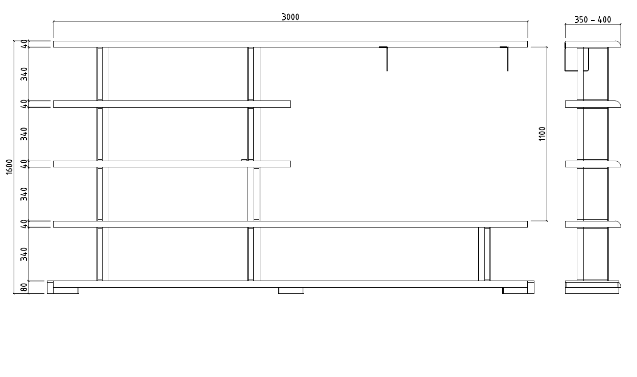 Soportes estructurales de hierro, estantes de roble macizo espesor 40 mm.