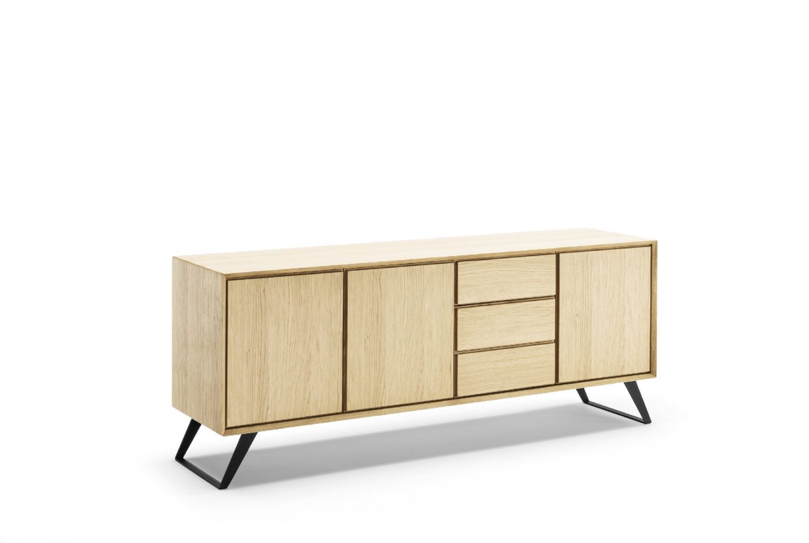 Aparador realizado totalmente en roble o nogal con superficie externa cepillada. Colas de vinílico y resinas ureicas base agua conformes a las normativas UNI-CEE. Base de madera maciza de roble, de acero recubierto con pintura de polvo u oxidado con acabados acrílicos.