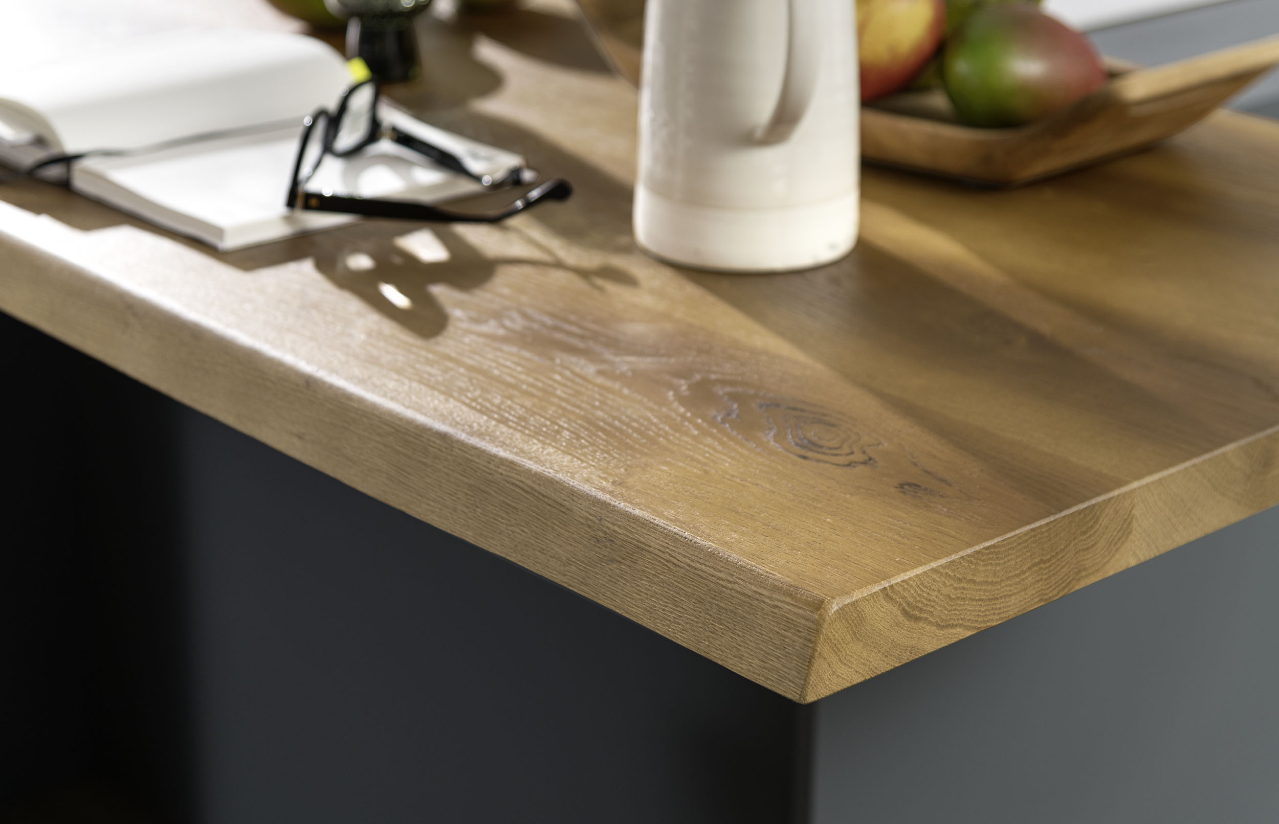 Planos espesor 40/45 mm de macizo de roble europeo irregular en los lados largos o con cuatro bordes rectos. Se mantiene la conformación natural del tronco, incluso de los cambios cromáticos naturales del producto. Colas de vinilo base agua, pinturas acrílicas dos componentes.