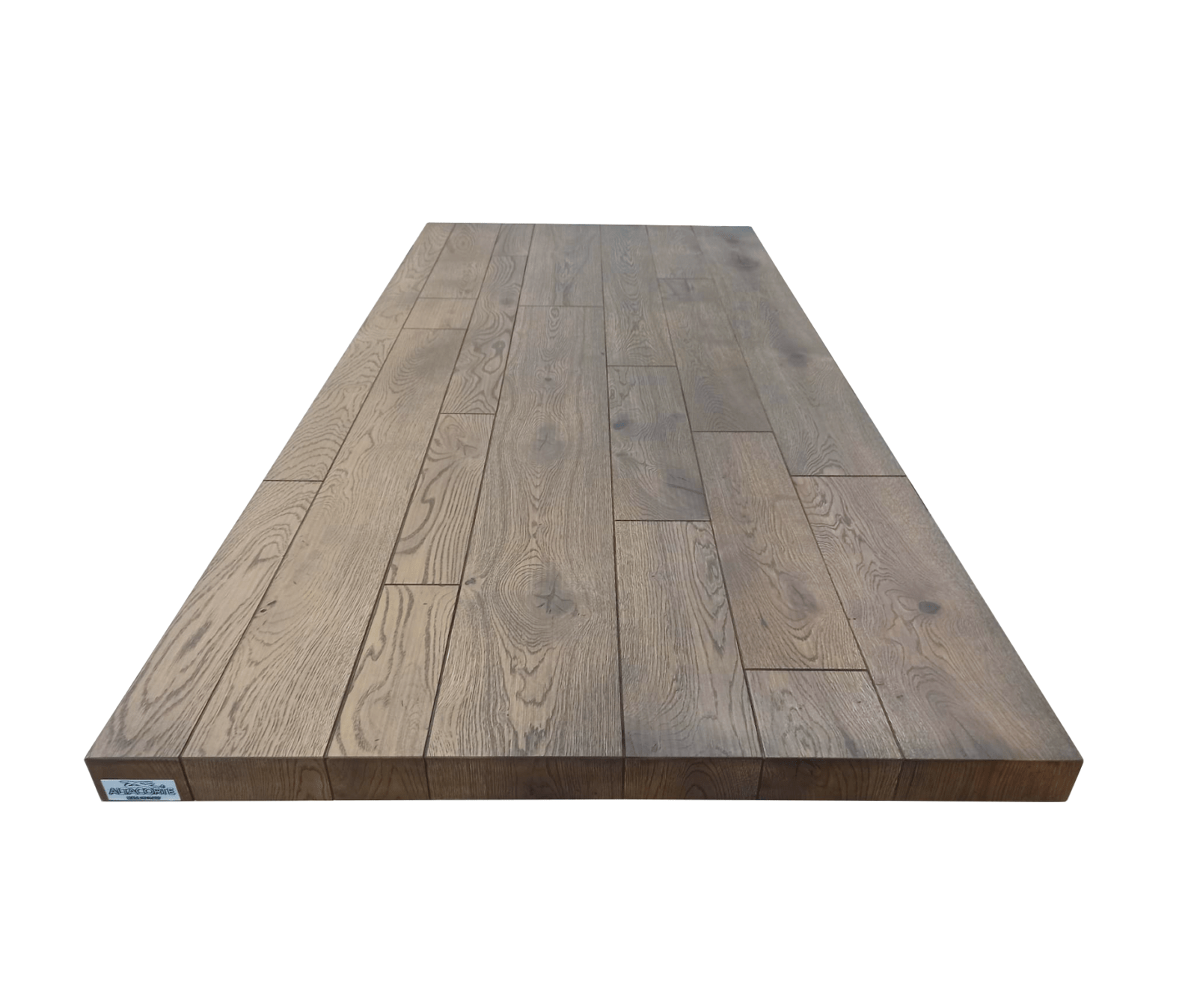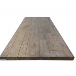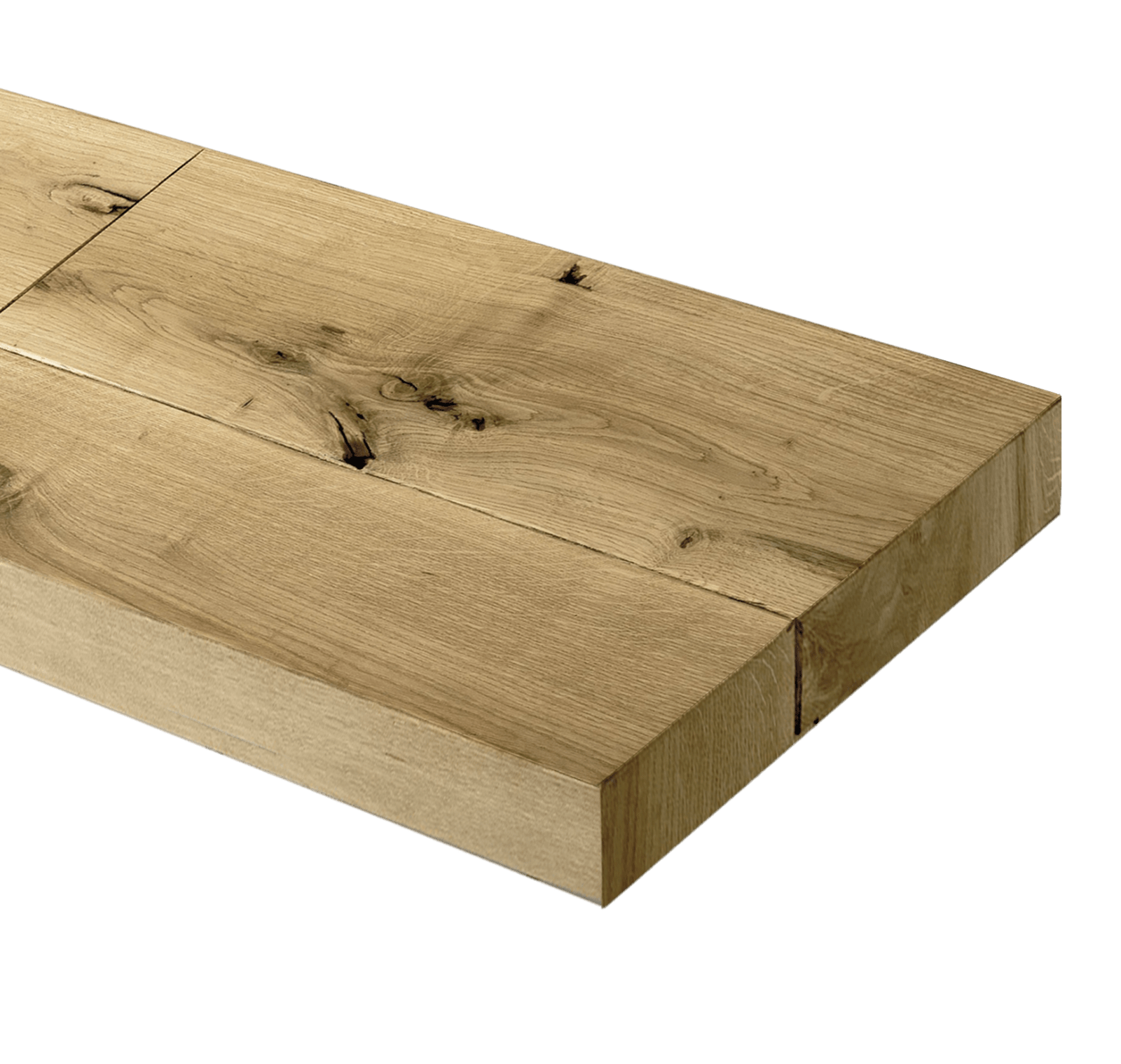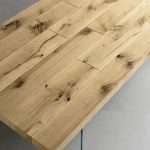Planos espesor 64 mm en plano de apoyo laminado o con carpeta contrachapada de roble nudoso y estucado para que tenga efecto de listones en la parte superior, inferior y perimetral de roble. Se mantiene la conformación natural del tronco, incluso de los cambios cromáticos naturales del producto. Colas de vinilo base agua, pinturas acrílicas dos componentes.