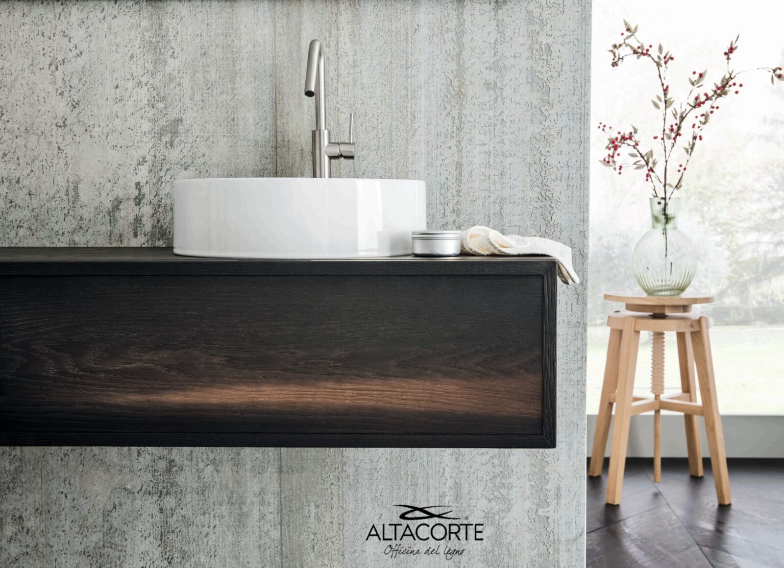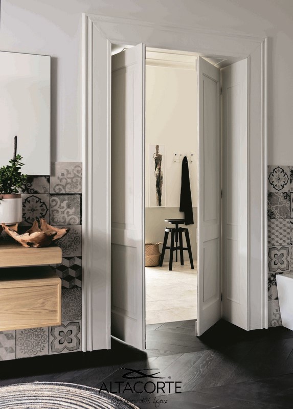 Roble macizo europeo o matérico. Colas de vinilo y resinas ureicas base agua conformes a las normativas UNI-CEE. Pinturas dos componentes.