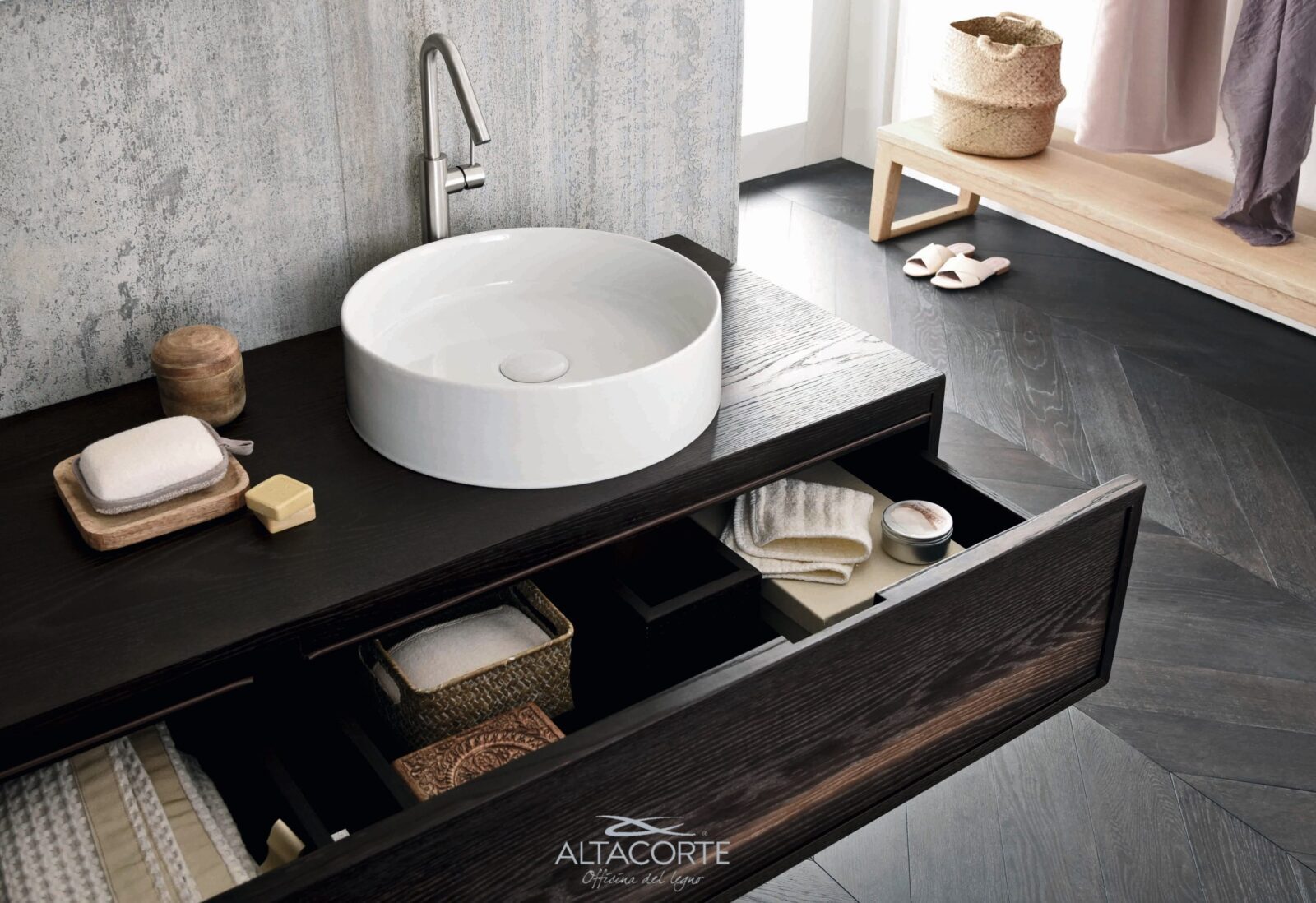 La familia Gap se compone de bases con cajones, bases para la parte inferior del lavabo y unidades de pared en diferentes dimensiones y con diferentes acabados, con estructura de matérico o de madera maciza con posibilidad de añadir una tapa de Laminam. La característica de esta familia es el sistema de apertura con puerta o cajón frontal con manija hundida y cuadratura del perímetro de las partes delanteras.