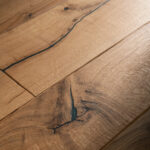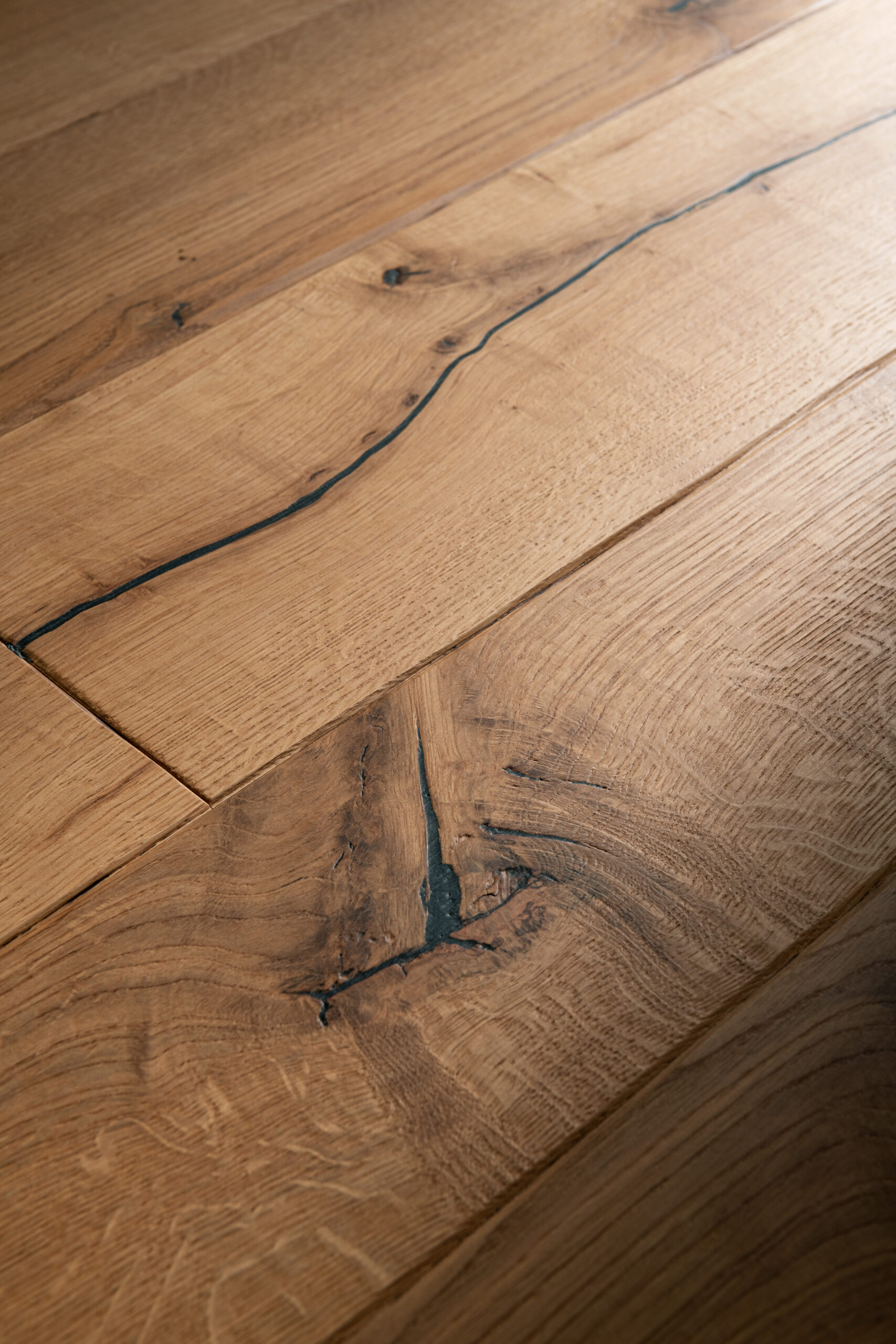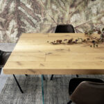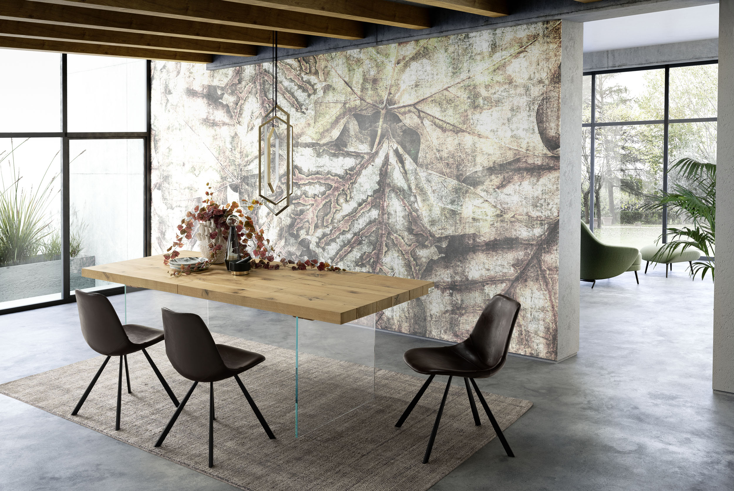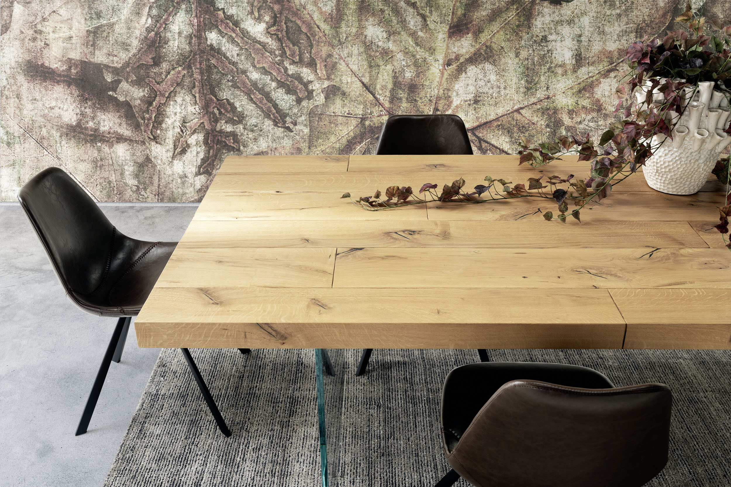 Patas de cristal templado extra claro con un espesor de solos 15 mm combinable con planos con espesores de 40/45 mm de roble macizo europeo o nogal Canaletto con carpeta contrachapada, espesor de 55/60 mm de roble macizo europeo, espesores de 64 mm en un plano de apoyo laminado o con carpeta contrachapada, lisa o con listones, superior, inferior y perimetral en roble. Colas de vinilo base agua, pinturas acrílicas dos componentes.