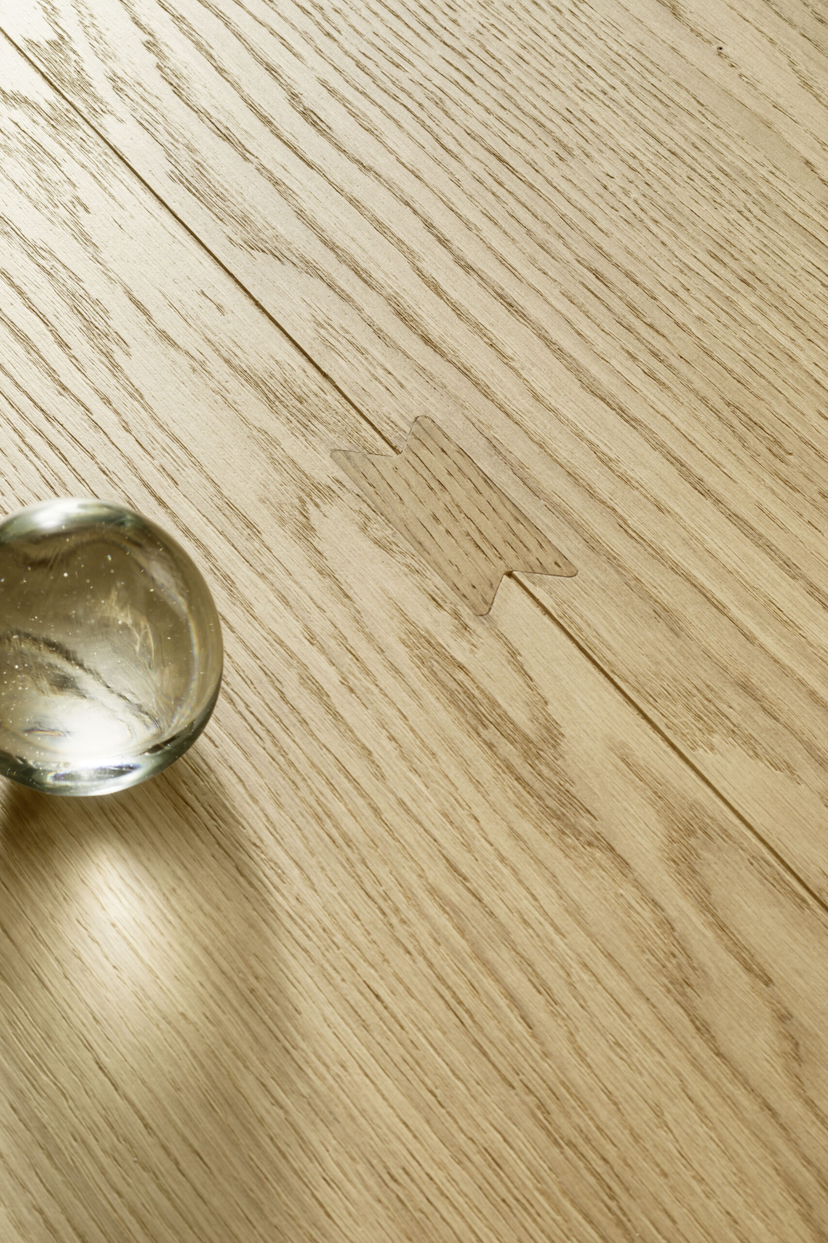 Estructura de roble macizo europeo, patas de roble macizo de 120 x 120 mm, plano espesor de 27/25 mm. Estructura y plano cepillados. Las mariposas grabadas en el plano pueden ser más o menos evidentes y pueden presentar un tono de color diferente la una de la otra. Esta característica no depende de un defecto de producción, sino que resalta la unicidad de cada creación. Colas de vinilo base agua, pinturas acrílicas dos componentes.