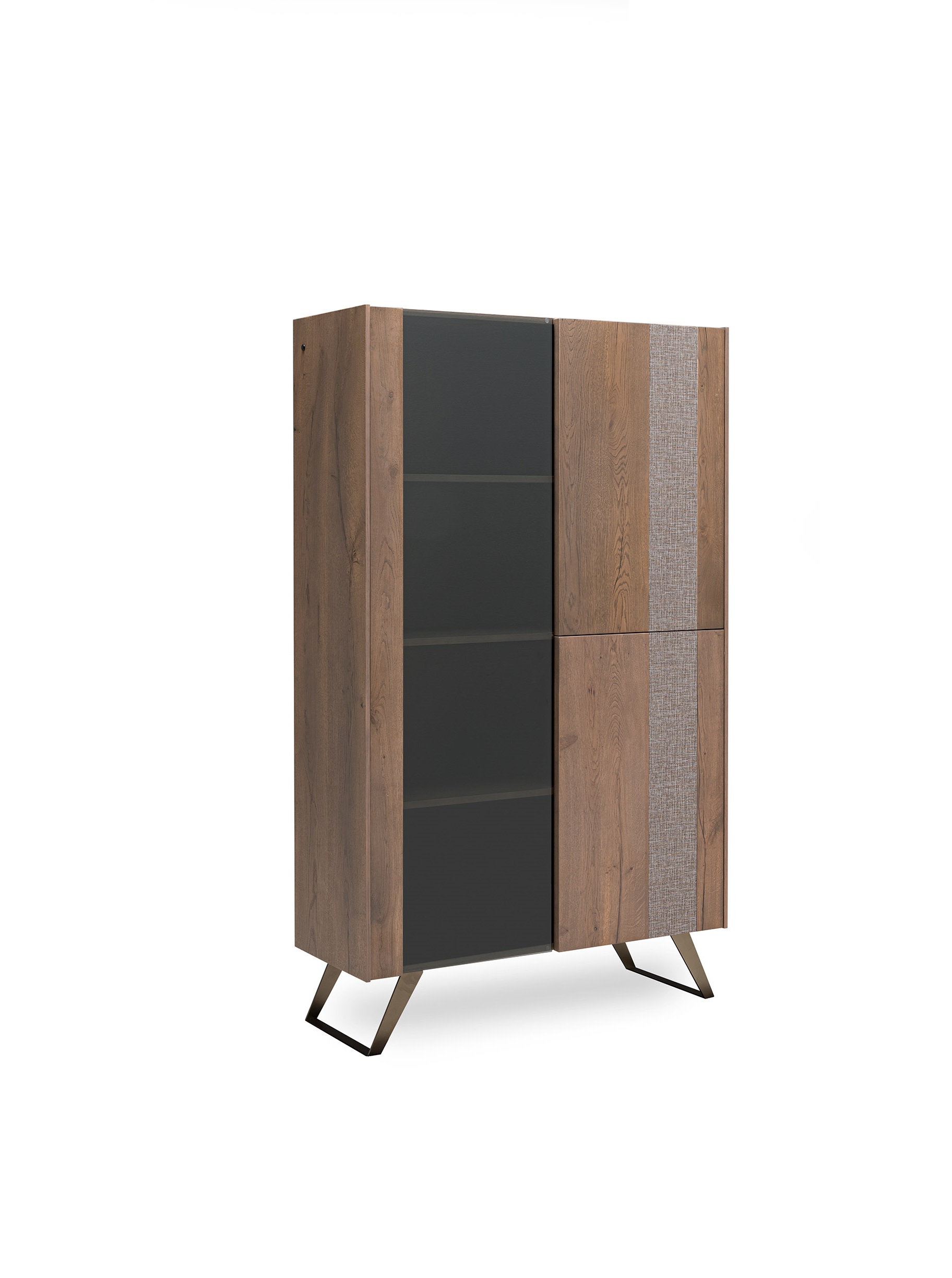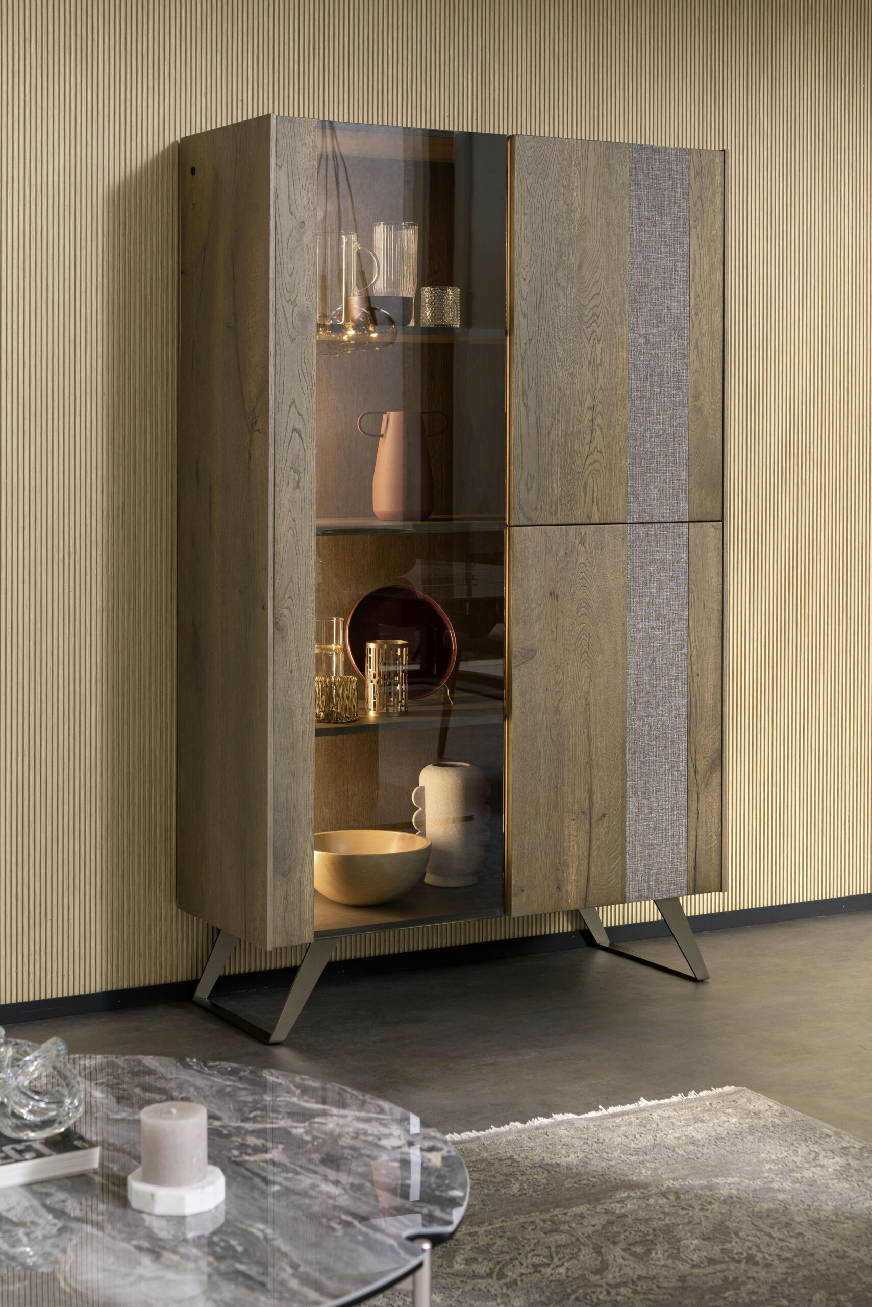 Shell available in two versions: textured or oak wood. Two oak doors, the third in 6 mm thick tempered smoked glass. Bases in powder-coated or oxidized steel with acrylic finish.
