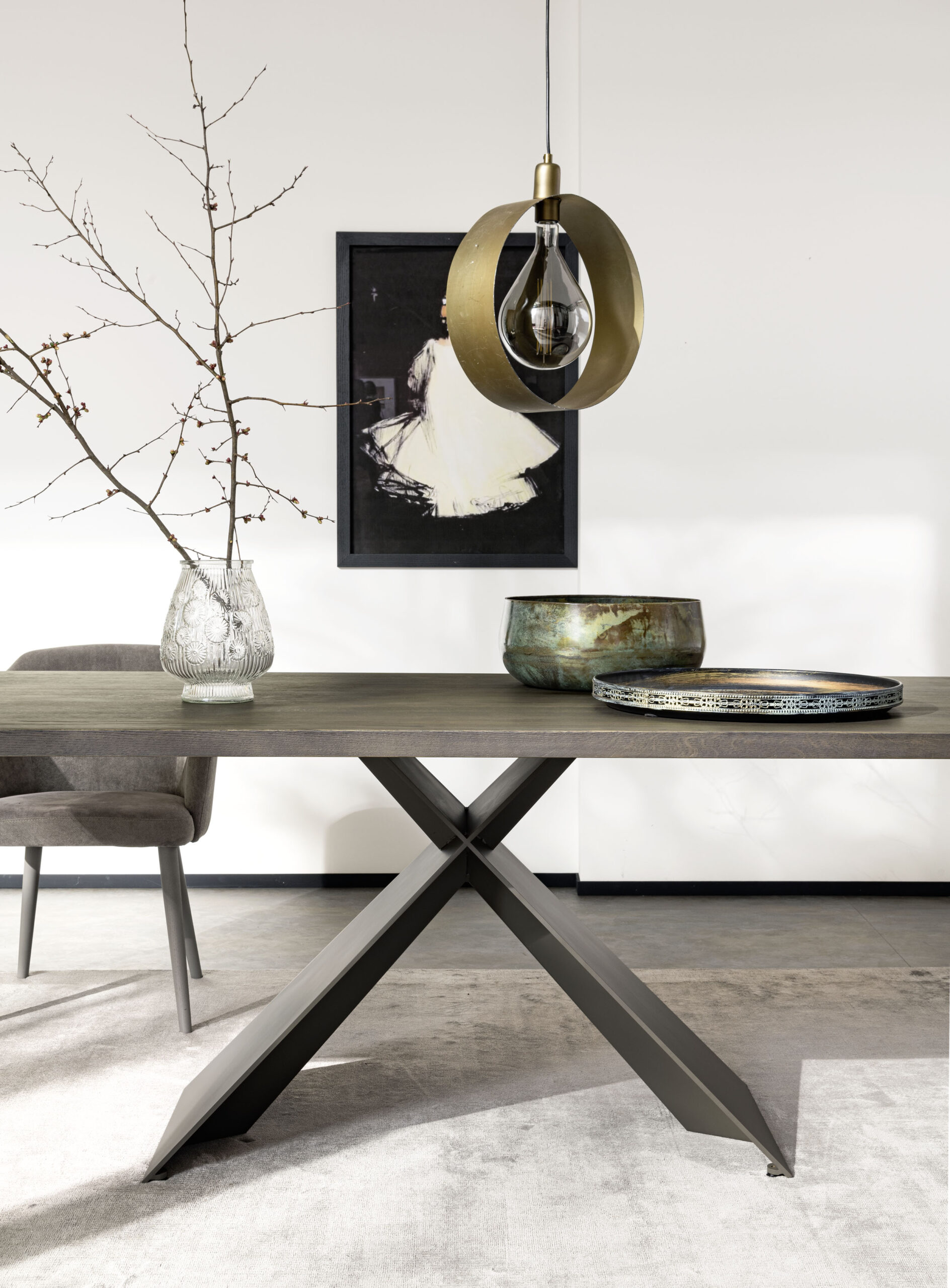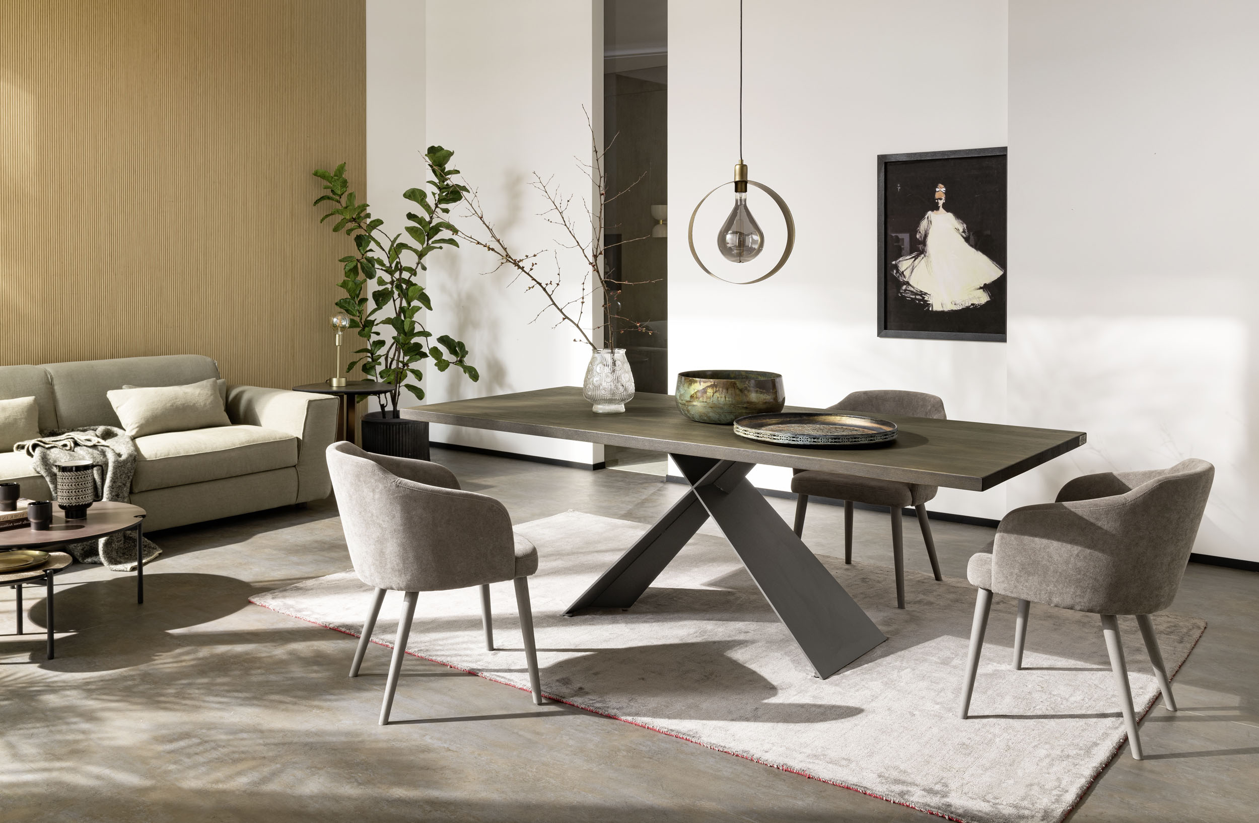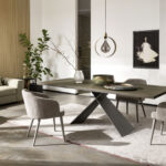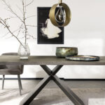 La mesa Xilo es fruto del lápiz del centro de estilo Altacorte. La rigidez formal de las geometrías elementales se ve adornada por ligeras y preciosas intervenciones estructurales dentro de la base, dando una sensación tridimensional de la forma. La mesa expuesta está decorada con un exclusivo tablero con inserción de madera fósil de origen fluvial, caracterizada por sedimentos particulares que la hacen única en cada elemento gracias a la fosilización milenaria del agua. Las operaciones de extracción de madera fósil se realizan de forma manual a partir de la arena y grava de los cauces de los ríos que han enterrado y conservado los troncos durante un periodo de más de 6.000 años. Los troncos más antiguos tienen más de 8.000 años y se caracterizan por tener tonos de color muy oscuros. La peculiaridad más significativa de la madera fósil es la singularidad natural que caracteriza cada tronco en cuanto a intensidad de color, diseño y tonalidades, haciendo que cada pieza sea diferente de las demás.